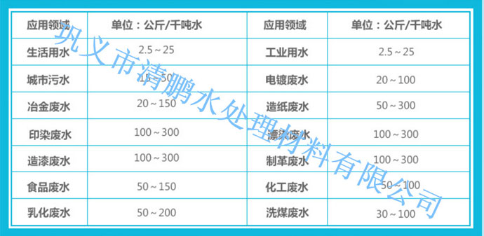 城市給排水凈化:河流水、水庫水、地下水,工業(yè)給水凈化,城市污水處理,工業(yè)廢水和廢渣中有用物質(zhì)的回收、促進洗煤廢水中煤粉的沉降、淀粉制造業(yè)中淀粉的回收,各種工業(yè)廢水處理:印染廢水、皮革廢水、含氟廢水、重金屬廢水、含油廢水、造紙廢水、洗煤廢水、礦山廢水、釀造廢水、冶金廢水、肉類加工廢水,污水處理,造紙助劑,布匹增強,催化劑載體,醫(yī)藥精制,水泥速凝,化妝品原料等。